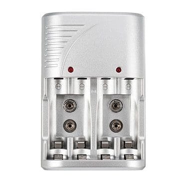 Cargador de batería 4 ranuras 1.2v AA AAA 9V 6F22 Li-ion Nimh Nicd Entrada 100 V – 240 V CA 50 / 60Hz Salida: 2,4 V CC 400 mA / 9 V CC 20 mA AA: 200 mA x 2/200 mA x 4 AAA: 100 mA x 2/100 mA x 4